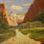 Follow the River Zion is a painting by Jim Burkholder of Rockartscity Gallery. The artist’s experience of hiking along the Virgin River that runs through Zion National Park provides inspiration for the painting. The steep canyon walls that allow sunlight and shadows provide a trail for the lone cowboy along the shallow running river. Follow the River Zion is for sale through our gallery. The cost is $1500 plus tax and shipping. Please contact our gallery here to purchase. In addition, please go to our facebook page for updated information.